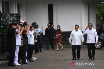 Presiden Joko Widodo (kanan) didampingi Menhan Prabowo Subianto (kiri) tiba di lokasi Rapim Kemhan 2023 di Jakarta, Rabu (18/1/2023). Rapim Kemhan 2023 mengangkat tema Pertahanan Negara yang Kuat Mendukung dan Mengamankan Pembangunan Nasional. ANTARA FOTO/Akbar Nugroho Gumay/aww.
