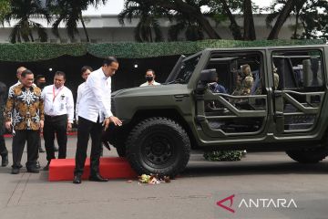 Presiden Joko Widodo meresmikan mobil Maung buatan Pindad pada Rapim Kemhan 2023 di Jakarta, Rabu (18/1/2023). Rapim Kemhan 2023 mengangkat tema Pertahanan Negara yang Kuat Mendukung dan Mengamankan Pembangunan Nasional. ANTARA FOTO/Akbar Nugroho Gumay/aww.