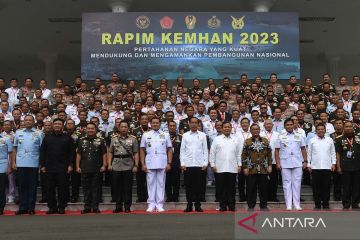 Presiden Joko Widodo (tengah) berfoto bersama Menhan Prabowo Subianto (ketiga kanan), Panglima TNI Laksamana TNI Yudo Margono (ketiga kiri), Kapolri Jenderal Pol Listyo Sigit Prabowo (kedua kiri), dan peserta Rapim Kemhan 2023 di Jakarta, Rabu (18/1/2023). Rapim Kemhan 2023 mengangkat tema Pertahanan Negara yang Kuat Mendukung dan Mengamankan Pembangunan Nasional. ANTARA FOTO/Akbar Nugroho Gumay/aww.