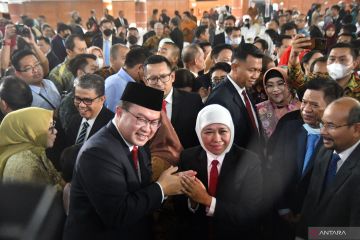 Rektor IPB Arif Satria (kiri, depan) berjabat tangan dengan Gubernur Jawa Timur Khofifah Indar Parawansa (kanan. depan) usai pelantikan Rektor IPB periode 2023-2028 dalam Sidang Paripurna Terbuka Majelis Wali Amanat IPB di Gedung Graha Widya Wisuda, Kampus IPB Dramaga, Kabupaten Bogor, Jawa Barat, Rabu (18/1/2023). Arif Satria secara resmi dilantik kembali menjadi Rektor IPB periode 2023-2028 setelah terpilih secara aklamasi melalui musyawarah mufakat yang diselenggarakan Majelis Wali Amanat IPB. ANTARA FOTO/Arif Firmansyah/hp.