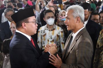 Rektor IPB Arif Satria (kiri) berbincang dengan Gubernur Jawa Tengah Ganjar Pranowo (kanan) usai pelantikan Rektor IPB periode 2023-2028 dalam Sidang Paripurna Terbuka Majelis Wali Amanat IPB di Gedung Graha Widya Wisuda, Kampus IPB Dramaga, Kabupaten Bogor, Jawa Barat, Rabu (18/1/2023). Arif Satria secara resmi dilantik kembali menjadi Rektor IPB periode 2023-2028 setelah terpilih secara aklamasi melalui musyawarah mufakat yang diselenggarakan Majelis Wali Amanat IPB. ANTARA FOTO/Arif Firmansyah/hp.