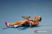 Reaksi petenis Belarusia Aryna Sabalenka usai memenangi pertandingan melawan petenis Kazakhstan Elena Rybakina pada final Australia Open 2023 di Melbourne Park, Melbourne, Australia, Sabtu (28/1/2023). Aryna Sabalenka memenangi pertandingan dengan 4-6, 6-3 dan 6-4. ANTARA FOTO/Reuters/Hannah Mckay/rwa.