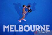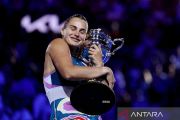 Petenis Belarusia Aryna Sabalenka mencium tropi usai memenangi pertandingan melawan petenis Kazakhstan Elena Rybakina pada final Australia Open 2023 di Melbourne Park, Melbourne, Australia, Sabtu (28/1/2023). Aryna Sabalenka merebut gelar Grand Slam pertamanya usai mengalahkan Elena Rybakina pada final Australia Open 2023. ANTARA FOTO/REUTERS/Sandra Sanders/rwa.