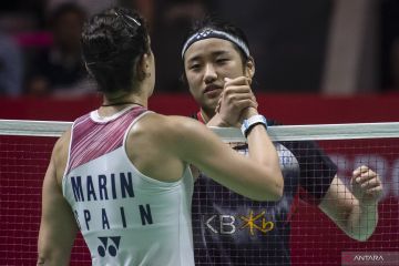 Pebulu tangkis tunggal putri Korea Selatan An Se Young (kanan) berjabat tangan dengan lawannya pebulu tangkis tunggal putri Spanyol Carolia Marin (kiri) usai bertanding dalam final turnamen Daihatsu Indonesia Masters 2023 di Istora Gelora Bung Karno, Senayan, Jakarta, Minggu (29/1/2023). An Se Young meraih juara Indonesia Masters 2023 usai menang dengan skor 18-21, 21-18, dan 21-13. ANTARA FOTO/M Risyal Hidayat/hp.