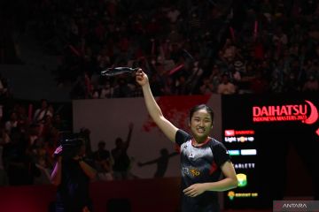 Pebulu tangkis tunggal putri Korea Selatan An Se Young berselebrasi usai memenangkan pertandingan saat berhadapan dengan pebulu tangkis tunggal putri Spanyol Carolina Marin pada final turnamen Daihatsu Indonesia Masters 2023 di Istora Gelora Bung Karno, Jakarta, Minggu (29/1/2023). An Se Young menjadi juara tunggal putri Daihatsu Indonesia Masters 2023 usai mengalahkan pebulu tangkis tunggal putri Spanyol Carolina Marin dengan skor 18-21, 21-18, dan 21-13. ANTARA FOTO/Indrianto Eko Suwarso/hp.
