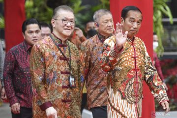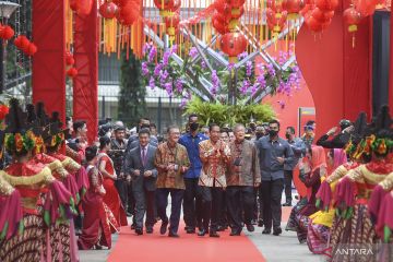 Presiden Joko Widodo (tengah) didampingi Ketua Pelaksana Perayaan Imlek Nasional 2023 Franky Oesman Widjaja (kedua kiri) dan Wakil Ketua Yayasan Buddha Tzu Chi Indonesia Sugianto Kusuma (kedua kanan) menghadiri Perayaan Imlek Nasional 2023 di Lapangan Banteng, Jakarta, Minggu (29/1/2023). Perayaan Imlek Nasional 2023 mengusung tema "Bersyukur, Bangkit, dan Maju Bersama". ANTARA FOTO/Hafidz Mubarak A/hp.