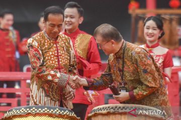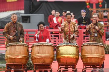 Presiden Joko Widodo (kedua kanan) bersama Presiden ke-5 Megawati Soekarnoputri (kedua kiri), Ketua Pelaksana Perayaan Imlek Nasional 2023 Franky Oesman Widjaja (kanan), dan Wakil Ketua Yayasan Buddha Tzu Chi Indonesia Sugianto Kusuma (kiri) menabuh gendang saat membuka Perayaan Imlek Nasional 2023 di Lapangan Banteng, Jakarta, Minggu (29/1/2023). Perayaan Imlek Nasional 2023 mengusung tema "Bersyukur, Bangkit, dan Maju Bersama". ANTARA FOTO/Hafidz Mubarak A/hp.