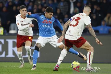 Pesepak bola Napoli Mathias Olivera berebut bola dengan pesepak bola AS Roma Cristian Volpato dan Gianluca Mancini dalam pertandingan lanjutan Liga Italia di Stadion Diego Armando Maradona, Naples, Italia, Senin (30/1/2023) dinihari. Napoli berada di puncak klasemen dengan poin 53 setelah berhasil menundukkan AS Roma dengan skor 2-1. ANTARA FOTO/Reuters-Ciro De Luca/nym.