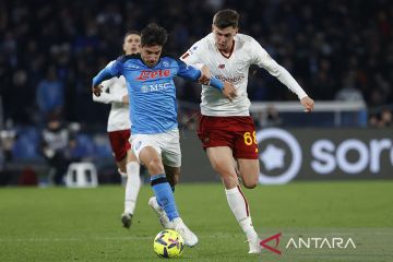 Pesepak Bola Napoli Giovanni Simeone berebut bola dengan pesepak bola AS Roma Benjamin Tahirovic dalam pertandingan lanjutan Liga Italia di Stadion Diego Armando Maradona, Naples, Italia, Senin (30/1/2023) dinihari. Napoli berada di puncak klasemen dengan poin 53 setelah berhasil menundukkan AS Roma dengan skor 2-1. ANTARA FOTO/Reuters-Ciro De Luca/nym.