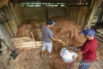 Pekerja menunjukkan serbuk kayu untuk dijadikan sebagai bahan bakar substitusi Pembangkit Listrik Tenaga Uap (PLTU) di Desa Sintung, Kecamatan Pringgarata, Lombok Tengah, NTB, Selasa (31/1/2023). Sepanjang tahun 2022, PLN NTB melalui program co-firing telah memproduksi energi bersih sebesar 4.205 MWh dengan memanfaatkan biomassa sebanyak 5.923 ton (serbuk kayu, bonggol jagung, potongan kayu, dan sekam padi) dalam proses co-firing PLTU di Lombok dan Sumbawa. ANTARA FOTO/Ahmad Subaidi/aww.