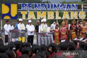 Presiden Joko Widodo (tengah) didampingi Menteri Agraria dan Tata Ruang/Kepala Badan Pertanahan Nasional (ATR/BPN) Hadi Tjahjanto (ketiga kiri) dan Sekretaris Kabinet Pramono Anung (keempat kiri) menekan tombol sirene sebagai tanda peresmian Bendungan Tamblang di Desa Sawan, Buleleng, Bali, Kamis (2/2/2023). Presiden meresmikan bendungan yang dibangun sejak tahun 2018 tersebut dengan anggaran Rp820 miliar yang memiliki kapasitas tampung 5,1 juta m3 dan luas genangan 29,8 ha yang digunakan untuk irigasi sawah dan mengurangi risiko banjir. ANTARA FOTO/Nyoman Hendra Wibowo/rwa.