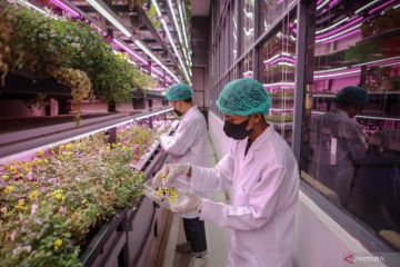 Petani melakukan perawatan tanaman di ruang penyemaian Semaii di sebuah kafe resto di kawasan Alam Sutera, Tangerang Selatan, Banten, Jumat (3/2/2023). Pertanian dengan konsep tertutup atau Controlled Environment Agriculture (CEA) tersebut menanam hingga 20 jenis tanaman yang dipasarkan ke berbagai restoran di Indonesia seperti Arugula, Swiss Chards, Chervil, Viola, Red Veined Sorrel, dan menjadi daya tarik tersendiri bagi pengunjung kafe tersebut. ANTARA FOTO/Fauzan/foc.