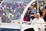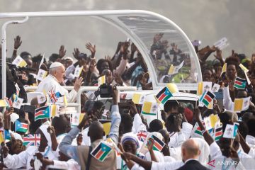 Paus Fransiskus menyapa umat saat Misa Kudus di Mausoleum John Garang, dalam perjalanan apostoliknya, di Juba, Sudan Selatan, Minggu (5/2/2023). ANTARA FOTO/Reuters-Yara Nardi/hp.