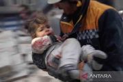 Tim penyelamat membawa seorang anak yang terluka dari reruntuhan gedung pascagempa Turki di Azaz, Suriah, Senin (6/2/2023). Gempa yang berpusat di Turki berdampak di Suriah dan mengakibatkan 245 orang meninggal dunia. ANTARA FOTO/REUTERS TV/via REUTERS TV/rwa.
