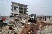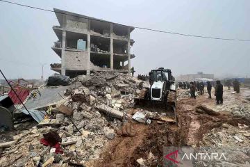 Tim penyelamat mencari korban selamat di bawah reruntuhan, menyusul gempa bumi yang berpusat di Turkii, di Kota Jandaris, Suriah, Senin (6/2/2023). ANTARA FOTO/REUTERS/Khalil Ashawi/rwa.