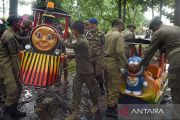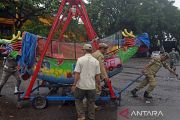 Sejumlah anggota Polisi Pamongpraja menertibkan wahana permainan anak di kawasan Stadion Maulana Yusuf Serang, Banten, Kamis (9/2/2023). Penertiban dilakukan untuk menegakkan ketertiban, keindahan dan kebersihan di ruang publik. ANTARA FOTO/Asep Fathulrahman/rwa.