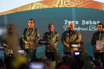 Presiden Joko Widodo (kedua kiri) berfoto bersama Ketua Umum Persatuan Wartawan Indonesia (PWI) Atal Sembiring (kiri), Gubernur Sumatera Utara Edy Rahmayadi (kedua kanan), dan pejabat lainnya saat menghadiri puncak peringatan Hari Pers Nasional (HPN) di Lapangan Astaka Pancing, Medan, Sumatera Utara, Kamis (9/2/2023). Presiden Joko Widodo mengatakan bahwa media telah berkontribusi besar dalam menyuarakan ajakan perjuangan Kemerdekaan Indonesia. ANTARA FOTO/Yudi/tom.