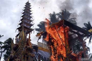 Prosesi pembakaran peti berbentuk naga saat upacara Ngaben putra bungsu dari pahlawan nasional I Gusti Ngurah Rai di Desa Carangsari, Badung, Bali, Jumat (10/2/2023). Upacara Ngaben terhadap jenazah I Gusti Ngurah Alit Yudha yang merupakan putra bungsu dari pahlawan nasional I Gusti Ngurah Rai tersebut diiringi oleh ribuan warga. ANTARA FOTO/Nyoman Hendra Wibowo/foc.