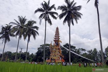 Sejumlah warga mengiringi arak-arakan Bade atau menara bertingkat sembilan yang berisi jenazah putra bungsu dari pahlawan nasional I Gusti Ngurah Rai saat prosesi upacara Ngaben di Desa Carangsari, Badung, Bali, Jumat (10/2/2023). Upacara Ngaben terhadap jenazah I Gusti Ngurah Alit Yudha yang merupakan putra bungsu dari pahlawan nasional I Gusti Ngurah Rai tersebut diiringi oleh ribuan warga. ANTARA FOTO/Nyoman Hendra Wibowo/foc.