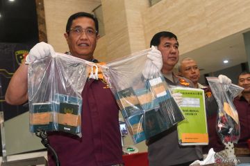 Direktur Tindak Pidana Umum (Dirtipidum) Bareskrim Polri Brigjen Pol Djuhandani Rahardjo Puro (kiri) dan Karopenmas Mabes Polri Brigjen Ahmad Ramadhan (kedua kiri) menunjukkan sejumlah paspor korban serta barang bukti lainnya saat konferensi pers terkait pengungkapan tindak pidana perdagangan orang (TPPO) di Bareskrim Mabes Polri, Jakarta, Jumat (10/2/2023). Bareskrim Polri mengungkap perdagangan orang (TPPO) jaringan internasional di Kamboja dengan menangkap lima tersangka yang diduga memperdagangkan orang untuk dipekerjakan sebagai operator, telemarketing, scamming dan judi online. ANTARA FOTO/Aditya Pradana Putra/foc.
