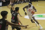 Pebasket RANS PIK Basketball Club Duom Dawam (kanan) berusaha melewati para pebasket Bali United Basketball Lutfi Alfian Eka Koswara (kedua kanan), Abraham R Wenas (kedua kiri) dan Sandy Febriansyakh Kurniawan (kiri) pada pertandingan Indonesian Basketball League (IBL) 2023 Seri III di DBL Arena, Surabaya, Jawa Timur, Minggu (12/2/2023). RANS PIK Basketball Club mengalahkan Bali United Basketball dengan skor akhir 83-72. ANTARA FOTO/Moch Asim/foc.