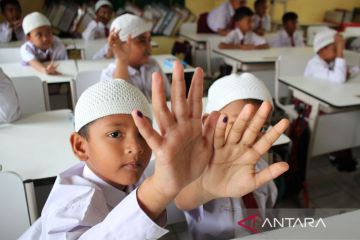 Siswa sekolah memperlihatkan jari mereka yang sudah dicap tinta sebagai tanda telah memperoleh vaksin polio tahap dua di Sekolah Dasar Negeri 7, Banda Aceh, Aceh, Senin (13/2/2023). Pemerintah Provinsi Aceh menggelar vaksin polio tahap dua secara serentak di sejumlah kabupaten/kota dengan target capaian sebanyak 1,2 juta anak pada 2023. ANTARA FOTO/Ampelsa/tom.