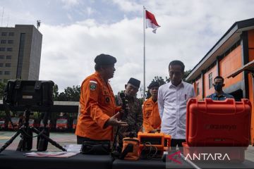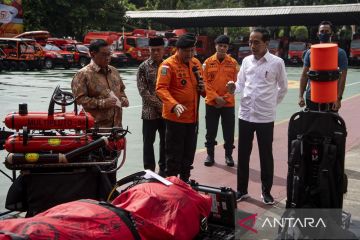 Presiden Joko Widodo (kanan) didampingi Menko PMK Muhadjir Effendy (ketiga kiri), Seskab Pramono Anung (kedua kiri) mendapat penjelasan dari Kepala Basarnas Marsekal Madya TNI Henri Alfiandi (keempat kiri) tentang peralatan SAR di sela Rapat Kerja Basarnas dan FKP3 Nasional 2023 di Kantor Pusat Basarnas, Jakarta, Kamis (16/2/2023). Rapat kerja dalam rangka HUT ke-51 Basarnas tersebut mengangkat tema Cepat Tanggap Selamatkan Jiwa. ANTARA FOTO/Sigid Kurniawan/tom.
