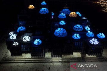 Foto udara Perpustakaan Nasional Kosovo saat kubahnya diterangi dengan warna bendera Kosovo pada perayaan 15 tahun kemerdekaan Kosovo, di Pristina, Kosovo (17/2/2023). ANTARA FOTO/REUTERS/Florion Goga/tom.