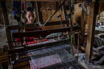 Perajin menyelesaikan produksi kain tradisional yang dijadikan keset dan lap pel di Kampung Babakan, Ibun, Kabupaten Bandung, Jawa Barat, Minggu (19/2/2023). Perajin menyatakan pada Januari 2023 produksi kain tradisional untuk dijadikan keset dan lap pel di Ibun mengalami peningkatan hingga dua ton kain per bulan dibandingkan pada Januari 2022 yang hanya dapat memproduksi setengah ton per bulan, seiring semakin normalnya aktivitas pascapandemi COVID-19. ANTARA FOTO/Raisan Al Farisi/foc.