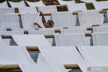 Perajin menjemur kain yang telah diproduksi di Kampung Babakan, Ibun, Kabupaten Bandung, Jawa Barat, Minggu (19/2/2023).Perajin menyatakan pada Januari 2023 produksi kain tradisional untuk dijadikan keset dan lap pel di Ibun mengalami peningkatan hingga dua ton kain per bulan dibandingkan pada Januari 2022 yang hanya dapat memproduksi setengah ton per bulan, seiring semakin normalnya aktivitas pascapandemi COVID-19. ANTARA FOTO/Raisan Al Farisi/foc.