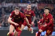 Pesepak bola AS Roma Ola Solbakken (kiri) nmelakukan selebrasii bersama rekannya Stephan El Shaarawy (kanan) setelah mencetak gol ke gawang Hellas Verona dalam laga lanjutan Liga Italia, di Stadion Olimpico, Roma, Italia, Minggu (18/2/2023). Gol tunggal Ola Solbakken menangkan Roma atas Hellas Verona dan untuk sementara menempati posisi ketiga dalam klasemen. ANTARA FOTO/Reuters-Alberto Lingria/hp.