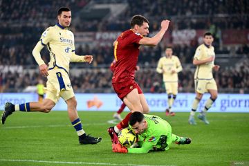 Peseppak bola AS Roma Andrea Belotti (te=bf=gah) beruoaya melewati penjagaan penjaga gawang Hellas VeronaLorenzo Montipo (kanan) dalam laga lanjutan Liga Italia, di Stadion Olimpico, Roma, Italia, Minggu (18/2/2023). Gol tunggal Ola Solbakken menangkan Roma atas Hellas Verona dan untuk sementara menempati posisi ketiga dalam klasemen. ANTARA FOTO/Reuters-Alberto Lingria/hp.