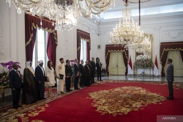 Presiden Joko Widodo (kanan) menerima surat kepercayaan dari Duta Besar LBBP Kesultanan Oman Mohamed Ahmed Salim Al Shanfari di Istana Merdeka, Jakarta, Senin (20/2/2023). Presiden menerima 11 surat kepercayaan dari duta besar LBBP negara sahabat. ANTARA FOTO/Sigid Kurniawan/hp.