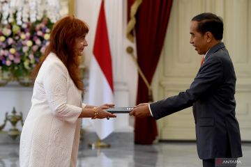 Presiden Joko Widodo (kanan) menerima surat kepercayaan dari Duta Besar LBBP Republik Yunani Stella Bezirtzoglou di Istana Merdeka, Jakarta, Senin (20/2/2023). Presiden menerima 11 surat kepercayaan dari duta besar LBBP negara sahabat. ANTARA FOTO/Sigid Kurniawan/hp.