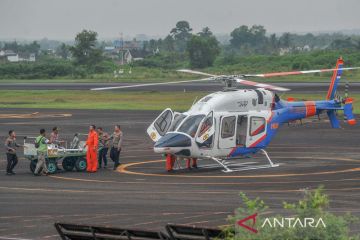 Helikopter Bell 429 milik Korpolairud Baharkam Polri yang membawa Tim SAR gabungan TNI, Polri, dan Basarnas terbang menuju Kabupaten Kerinci dari Bandara Sultan Thaha lama, Jambi, Senin (20/2/2023). Selain menggunakan jalur darat, upaya evakuasi kecelakaan helikopter yang ditumpangi Kapolda Jambi di Bukit Tamiai, Muara Emat, Kabupaten Kerinci pada hari kedua pascakecelakaan juga diusahakan menggunakan jalur udara. ANTARA FOTO/Wahdi Septiawan/aww.