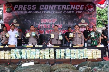 Kapolda Metro Jaya Irjen Pol Fadil Imran (tengah) bersama Kabid Humas Polda Metro Jaya Kombes Pol Trunoyudo Wisnu Andiko (kedua kanan), Dirresnarkoba Polda Metro Jaya Kombes Pol Mukti Juharsa (kiri), Kapolres Metro Jakarta Barat Kombes Pol Pasma Royce (kedua kiri) dan Dandim 0503/Jakarta Barat Letkol Kav I Made Maha Yudhiksa (kanan) menunjukkan barang bukti sabu saat rilis di Polres Metro Jakarta Barat, Kamis (23/2/2023). Polres Metro Jakarta Barat berhasil mengungkap peredaran narkoba jaringan internasional dengan bukti sabu-sabu seberat 277 kg yang disita dari enam orang tersangka. ANTARA FOTO/Prabanndaru Wahyuaji/sgd/hp.