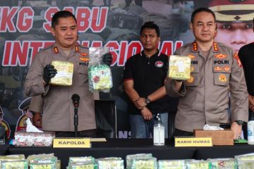 Kapolda Metro Jaya Irjen Pol Fadil Imran (kiri) bersama Kabid Humas Polda Metro Jaya Kombes Pol Trunoyudo Wisnu Andiko menunjukkan barang bukti sabu saat rilis di Polres Metro Jakarta Barat, Kamis (23/2/2023). Polres Metro Jakarta Barat berhasil mengungkap peredaran narkoba jaringan internasional dengan bukti sabu-sabu seberat 277 kg yang disita dari enam orang tersangka. ANTARA FOTO/Prabanndaru Wahyuaji/sgd/hp.