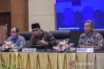 Wakil Menteri Keuangan Suahasil Nazara (kanan) didampingi Sekretaris Jenderal Kemenkeu Heru Pambudi (kiri) dan Direktur Jenderal Pajak Kemenkeu Suryo Utomo (tengah) menggelar konferensi pers penanganan internal Kementerian Keuangan atas kasus Rafael Alun Trisambodo di Kantor Pusat Ditjen Pajak, Jakarta, Jumat (24/2/2023). Dalam konfrensi pers tersebut, Menteri Keuangan Sri Mulyani Indrawati mencopot jabatan struktural dan tugas-tugas Rafael Alun Trisambodo sebagai Kepala Bagian Umum Kantor Wilayah Direktorat Jenderal Pajak Kemenkeu, Rafael dicopot dari jabatannya terkait buntut kasus penganiayaan yang dilakukan anaknya, Mario Dandy Satriyo. ANTARA FOTO/Galih Pradipta/rwa.