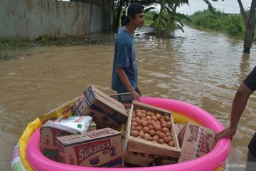 Seorang warga membawa logistik makanan untuk korban banjir di Puri Nirwana Residence, Cikarang Utara, Kabupaten Bekasi, Jawa Barat, Sabtu (25/2/2023). Menurut warga banjir telah menggenangi wilayah tersebut selama dua hari dari ketinggian 30 cm-1 meter dan penyebab banjir akibat luapan Kali Ulu. ANTARA FOTO/ Fakhri Hermansyah/hp.