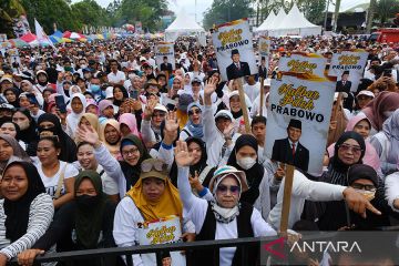 Ribuan warga mengikuti kegiatan HUT ke-15 Partai Gerindra di Taman Alun Kapuas, Pontianak, Kalimantan Barat, Minggu (26/2/2023). Dalam kesempatan tersebut, DPD Partai Gerindra Provinsi Kalimantan Barat menyatakan dukungan kepada Prabowo Subianto untuk maju kembali dalam Pilpres mendatang. ANTARA FOTO/Jessica Helena Wuysang/rwa.