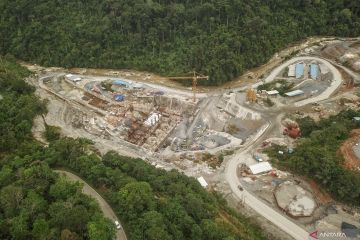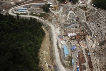 Foto udara pembangunan Pembangkit Listrik Tenaga Air (PLTA) Kerinci Merangin Hidro di Kawasan Adat Muara Langkap dan Rencong Telang, Batang Merangin, Kerinci, Jambi, Senin (27/2/2023). Masyarakat adat Muara Langkap menuntut pembangunan PLTA di kawasan adat mereka dilakukan secara transparan dan memperhatikan dampak lingkungan. ANTARA FOTO/Wahdi Septiawan/foc.