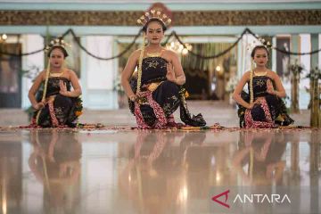 Penari membawakan tarian Bedhaya Anglir Mendhung pada acara Tingalan Jumenengan Mangkunagoro X di Pura Mangkunegaran, Solo, Jawa Tengah, Rabu (1/3/2023). Tingalan Jumenengan atau peringatan kenaikan tahta Mangkunegaran Kanjeng Gusti Pangeran Adipati Arya (KGPAA) Mangkunegara X yang pertama tersebut ditandai dengan tarian Bedhaya Anglir Mendhung dan kirab mengelilingi Pura Mangkunegaran. ANTARA FOTO/Mohammad Ayudha/rwa.