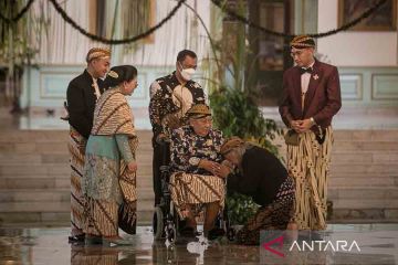 Kanjeng Gusti Pangeran Adipati Arya (KGPAA) Mangkunegara X (kanan) bersama Abdi dalem menyalami Raja Keraton Kasunanan Surakarta Paku Buwono (PB) XIII (ketiga kanan) pada acara Tingalan Jumenengan Mangkunagoro X di Pura Mangkunegaran, Solo, Jawa Tengah, Rabu (1/3/2023). Tingalan Jumenengan atau peringatan kenaikan tahta Mangkunegaran Kanjeng Gusti Pangeran Adipati Arya (KGPAA) Mangkunegara X yang pertama tersebut ditandai dengan tarian Bedhaya Anglir Mendhung dan kirab mengelilingi Pura Mangkunegaran. ANTARA FOTO/Mohammad Ayudha/rwa.