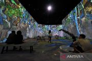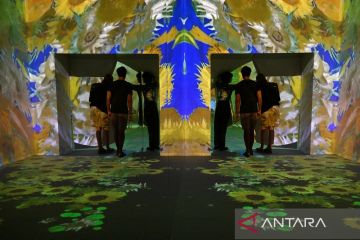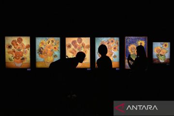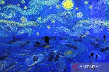 Pengunjung melihat karya seni pada pameran multi-sensorik âVan Gogh: The Immersive Experienceâ yang menampilkan lebih dari 300 karya dari seniman Vincent Van Gogh di Resorts World Sentosa, Singapura (3/3/2023). ANTARA FOTO/REUTERS/Caroline Chia/tom.