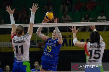 Pebola voli Bandung BJB Tandamata Ceren Kapucu (tengah) mengembalikan bola yang coba diblok pebola voli Jakarta Pertamina Fastron Yolla Yuliana (kanan) dan Marija Zelenovic (kiri) pada pertandingan seri kedua putaran pertama final four putri PLN Mobile Proliga 2023 di GOR Jatidiri, Semarang, Jawa Tengah, Jumat (3/3/2023). Bandung BJB Tandamata mengalahkan Jakarta Pertamina Fastron dengan skor 3-0 (25-18, 25-20, dan 25-15), sekaligus menyabet juara putaran pertama final four putri. ANTARA FOTO/Aji Styawan/tom.