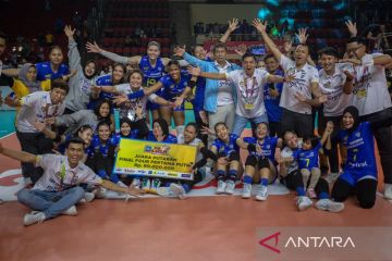 Sejumlah pebola voli Bandung BJB Tandamata meluapkan ekspresi usai mengalahkan tim Jakarta Pertamina Fastron pada pertandingan seri kedua putaran pertama final four putri PLN Mobile Proliga 2023 di GOR Jatidiri, Semarang, Jawa Tengah, Jumat (3/3/2023). Bandung BJB Tandamata mengalahkan Jakarta Pertamina Fastron dengan skor 3-0 (25-18, 25-20, dan 25-15), sekaligus menyabet juara putaran pertama final four putri. ANTARA FOTO/Aji Styawan/tom.