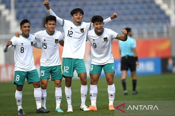 Pemain Timnas U-20 Indonesia Hokky Caraka (kanan) bersama rekan setimnya melakukan selebrasi seusai berhasil mencetak gol ke gawang Timnas U-20 Suriah dalam kualifikasi Grup A Piala Asia U-20 di Stadion Lokomotiv, Tashkent, Uzbekistan, Sabtu (4/3/2023). ANTARA FOTO/Sigid Kurniawan/pras.