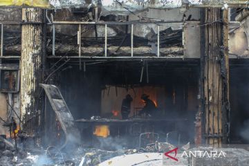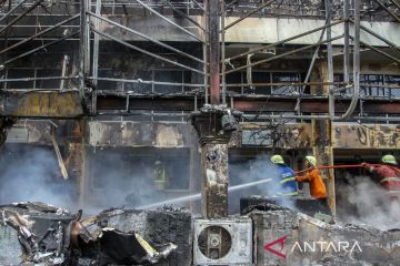 Petugas pemadam kebakaran berusaha memadamkan api yang membakar gedung Mal Pelayanan Publik (MPP) Pekanbaru, Riau, Minggu (5/3/2023). Petugas terkait masih menyelidiki penyebab terjadinya kebakaran yang menghanguskan gedung utama MPP tersebut. ANTARA FOTO/Rony Muharrman/tom.