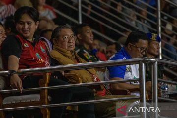 Presiden ke-6 RI Susilo Bambang Yudhoyono (kedua kiri) selaku pembina tim voli Jakarta Lavani Allo Bank menyaksikan timnya melawan Surabaya BIN Samator pada pertandingan seri kedua putaran kedua final four PLN Mobile Proliga 2023 di GOR Jatidiri, Semarang, Jawa Tengah, Minggu (5/3/2023). Jakarta Lavani Allo Bank mengalahkan Surabaya BIN Samator dengan skor 3-0 (25-19, 25-22, 28-26). ANTARA FOTO/Aji Styawan/tom.