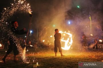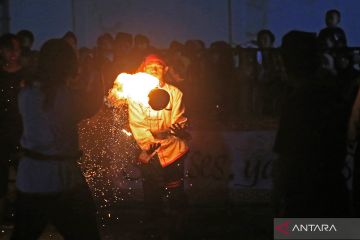 Sejumlah santri dari pondok pesantren Babakan Ciwaringin bermain atraksi api di desa Babakan Ciwaringin, Kabupaten Cirebon, Jawa Barat, Minggu (5/3/2023). Tradisi pesta api yang gelar setiap tahun itu sebagai simbol keberanian dan ujian kenaikan tingkat santri di pesantren tersebut. ANTARA FOTO/Dedhez Anggara/foc.